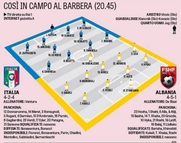 L’Albania del ct Gianni De Biasi risponde con un più abbottonato 4-5-1 di partenza; vaie le conoscenze albanesi del nostro calcio, a cominciare da uno dei leader, il terzino del Napoli Hysaj. Ma anche il portiere laziale Strakosha, il centrale del Torino Ajeti, il mediano Memushaj del Pescara e l’ex parmense Lila.