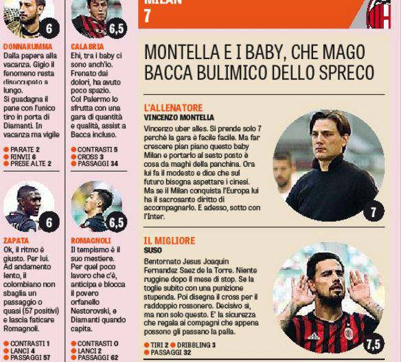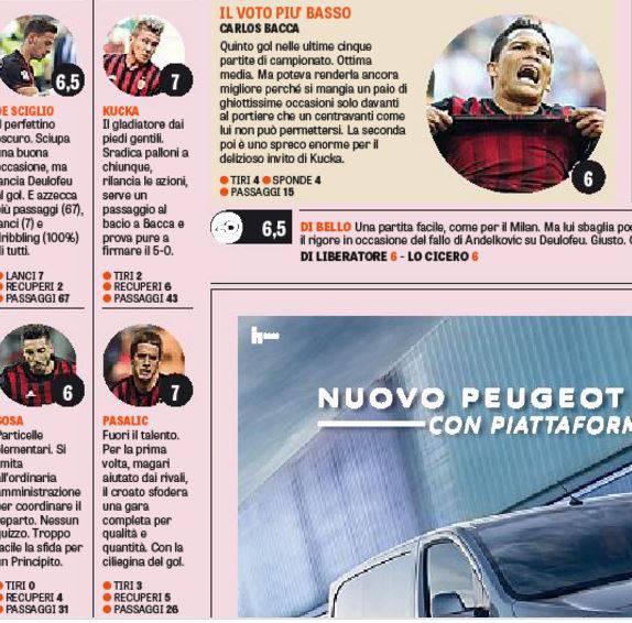 Come di consueto la Gazzetta dello Sport ha pubblicato voti e pagelle dei calciatori del Milan dopo la vittoria scintillante di ieri a San Siro. Nessuna insufficienza nella squadra di Montella, ma c’è un sorprendente 6 per Carlos Bacca, che nonostante il gol segnato appare il meno brillante dei suoi per le troppe chance sprecate. Così come Gianluca Lapadula che non sfrutta l’occasione di giocare nel secondo tempo.