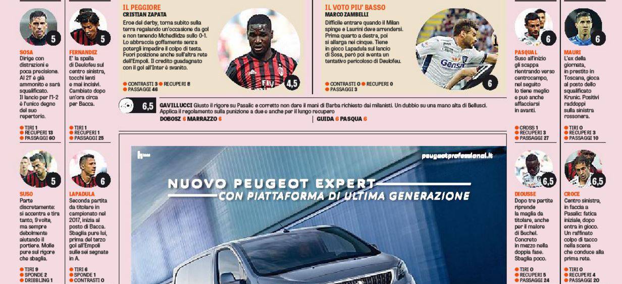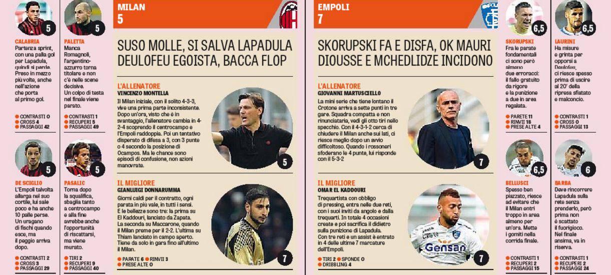 Tante, troppe le note dolenti: da Cristian Zapata (voto 4,5) che è passato dalla gloria del derby agli errori grossolani di ieri, fino a Jesus Suso che tra giocate prevedibili e rigore fallito si prende un 5 pieno. Lo steso voto con cui la ‘rosea’ boccia il resto di difesa e centrocampo del Milan schierato ieri. Un po’ meglio Deulofeu (voto 5,5) che come al solito appare pericoloso, ma stavolta gioca troppo da solista.
