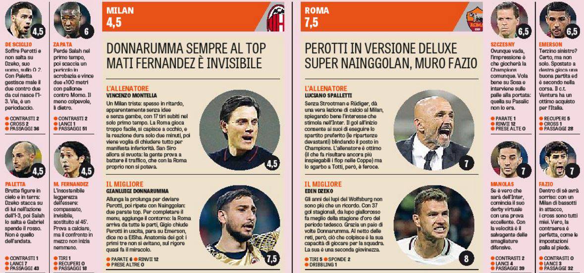 Tante, troppe le note negative: su tutte Leonel Vangioni, bocciato con un secco 4,5 per aver concesso spazi e praterie dalla parte di Salah e sbagliato numerose giocate. Disastrosi anche Paletta e De Sciglio, mentre sono puniti con un 5 in pagella gli elementi che avrebbero dovuto dare qualcosa in più come Suso, Deulofeu e Lapadula, tutti impalpabili e annullati dalla difesa romanista.
