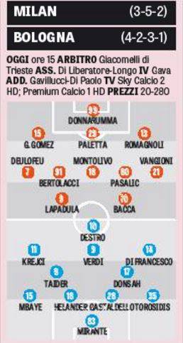 Il Bologna risponde con un 4-2-3-1 di fantasia; l’ex Verdi assieme a Di Francesco e Krejci agiranno alle spalle di un’altra vecchia conoscenza milanista come Mattia Destro, con l’intento di far venire il mal di testa alla difesa di Montella, anche se ormai i felsinei hanno raggiunto la matematica salvezza da settimane.