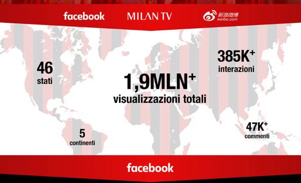 Oggi il sito ufficiale acmilan.com mette in evidenza i dati registrati in occasione di questa amichevole. Su Facebook oltre 10 milioni le impression totali, 6.9 milioni gli utenti raggiunti, 1.8 milioni le visualizzazioni. Le diverse reaction sono state oltre 300mila, più di 47mila i commenti e oltre 9mila le condivisioni della diretta del match. I 5 Paesi che hanno mostrato maggiore interesse per l’evento digitale sono stati Italia, Stati Uniti, Indonesia, Messico e Germania.