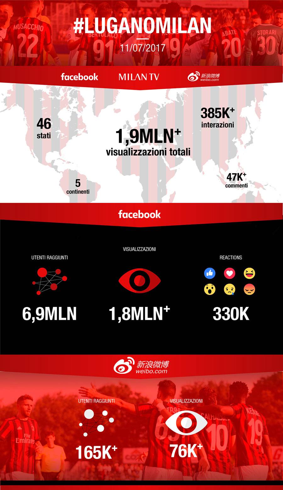 Per quanto concerne la diretta social in cinese sul profilo rossonero di Weibo, nonostante l’ora tarda (al momento del calcio d’inizio in Cina era l’1 di notte), il live dell’amichevole Lugano-Milan ha raggiunto oltre 165mila utenti. Numero comunque interessante, considerando orario e impegno non di alto livello.