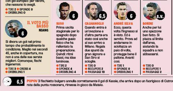 Tra i meno brillanti (non vi sono bocciature) c’è M’Baye Niang, generoso ma impreciso sotto porta e nel momento dell’assist decisivo. Sufficienza piena anche per il duo Zapata-Musacchio, che corre pochissimi pericoli, e per Locatelli che in mezzo al campo giostra con serenità, senza strafare.