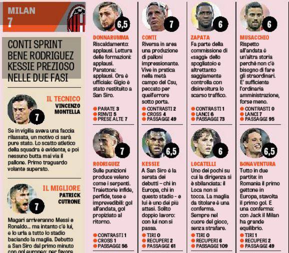 Stesso voto anche per Andrea Conti, che non fallisce l’esordio da titolare: un treno sulla fascia destra per tutti i 90 minuti. Bene anche Ricardo Rodriguez dalla parte opposta, abile a creare apprensione alla retroguardia ospite. Ok il rientro a San Siro di Giacomo Bonaventura, non ancora al top della forma ma premiato con un 6,5 meritato per gol e solito dinamismo tattico.