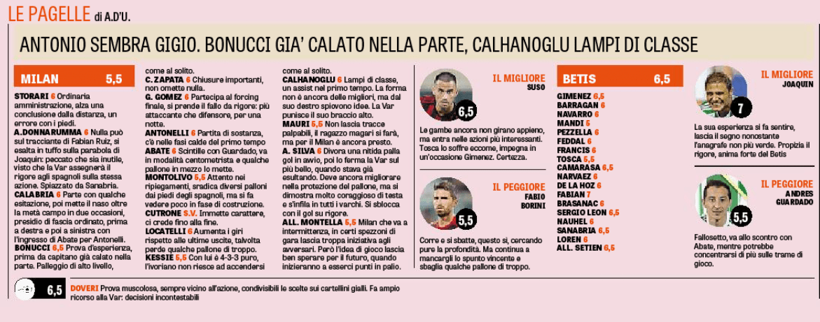 La Gazzetta dello Sport stamane ha stilato le consuete pagelle. I migliori nelle fila del Milan sono risultati con Leonardo Bonucci e Suso, a cui è stato dato 6.5. L’ex Juventus alla prima da capitano ha fornito una prova d’esperienza. Lo spagnolo, non ancora al top, è ispirato e rappresenta una certezza per i rossoneri.