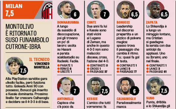 Come di consueto, ecco voti e pagelle della Gazzetta dello Sport dopo il successo europeo del Milan, abile a concretizzare il più possibile ed archiviare la pratica playoff. Il migliore in campo è Riccardo Montolivo, colui che non ti aspetti, tornato ad alti livelli con due reti splendide e tante giocate preziose in mezzo al campo. Voto 7,5 per l’ex capitano, lo stesso assegnato ad altri grandi protagonisti, come André Silva scatenato sotto porta o Jesus Suso che è già ispiratissimo tra assist e meravigliose giocate sullo stretto.