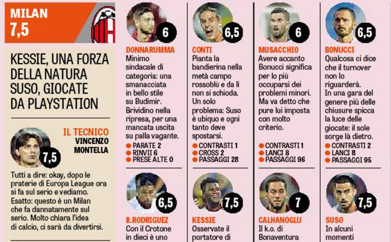 Sorprende in positivo il turco Hakan Calhanoglu, che si merita un 7 in pagella per una prova di personalità e presenza assoluta in mezzo al campo. Positive anche le prove, senza enormi encomi, dei terzini Conti e Rodriguez, spine nel fianco della difesa avversaria. Tra i meno brillanti si segnala Manuel Locatelli: in cabina di regia combatte bene ma svolge il compitino senza dare troppo ritmo e vivacità alla manovra. Da uno col suo talento ci si aspetta qualcosa in più sempre.