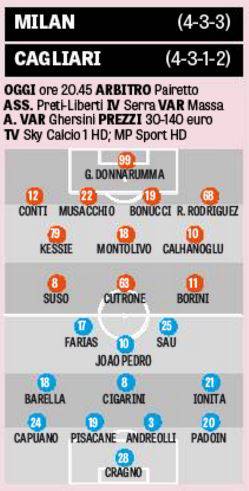 Per cercare i tre punti e non perdere distacco dai rivali dell’Inter e della Juventus, ieri entrambe vittoriose, il Milan affronterà la compagine sarda nel debutto a San Siro con la migliore formazione possibile. Sicuro, come ammesso da Vincenzo Montella, l’abbandono momentaneo al 3-5-2 che andrà ancora studiato e provato in allenamento.