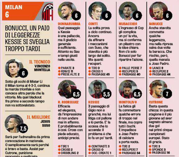 Oggi la Gazzetta dello Sport ha pubblicato voti e pagelle della sfida di ieri sera a San Siro vinta di misura dal Milan. Nelle fila rossonere senza dubbio il migliore è Suso, premiato con un 7,5 per l’assist ed il gol entrambi determinanti. Tra i più positivi anche Patrick Cutrone, autore della prima rete di serata che lo pone in stato di grazia. Voto 7 per il giovane bomber, mentre si accontenta del 6,5 un ottimo Riccardo Montolivo, che fa fatica come il resto dei compagni ma merita gli elogi per alcuni recuperi eccellenti da mediano vecchia scuola.