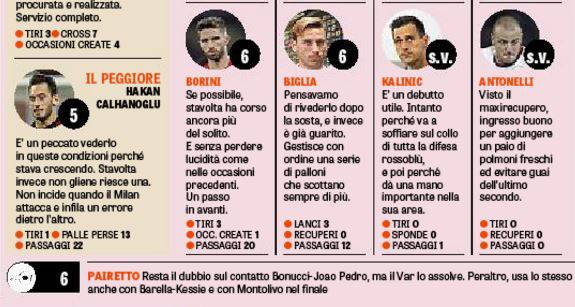 Sufficienti tutti gli elementi della difesa, compreso un Bonucci che a tratti commette qualche leggerezza inaspettata. Ma i veri flop sono dei neo-acquisti a centrocampo: Hakan Calhaoglu si becca un 5 pieno per via di una prova piena di errori, mentre 5,5 e prima mezza bocciatura per Franck Kessié che sbaglia clamorosamente anche nell’occasione del pareggio sardo, anche se è abile a crescere nel finale.