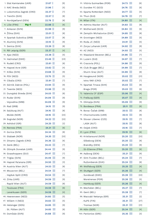 Il club di via Aldo Rossi ha un’età media di 24,80 anni, che la piazzano al 55° posto, più nello specifico al 6° posto nella classifica riguardante esclusivamente i top 5 campionati europei. Il dato che più fa riflettere è che il Milan è il solo club italiano presente a livello europeo: il resto della Serie A infatti è assente dalla classifica dei primi 100 (foto in basso). Tra le 31 leghe europee, la squadra più giovane sono gli ucraini dello Stal Kamianske (21.7 anni), mentre considerando i tornei maggiori è il Lille.