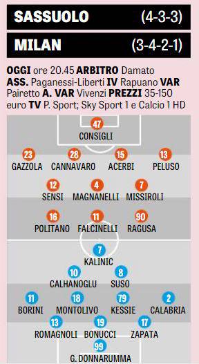 La sorpresa potrebbe essere l’impiego di Davide Calabria dal 1′ minuto come esterno destro, con lo spostamento di Fabio Borini a sinistra e Rodriguez relegato in panchina. In mezzo chance per Manuel Locatelli in regia accanto a Kessié. Infine ballottaggio in difesa tra Zapata e Musacchio, con il colombiano in leggero vantaggio.