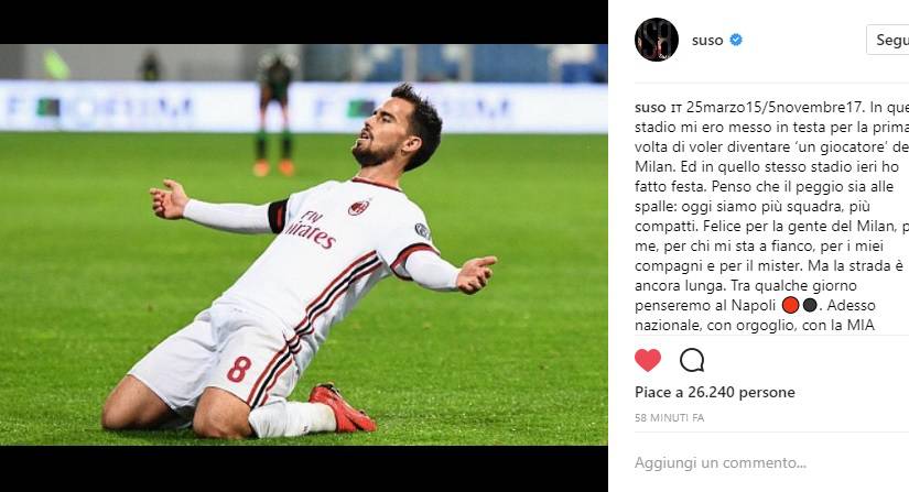 I meriti maggiori sono però tutti del calciatore. Più volte ha espresso la sua felicità per la maglia che indossa e ha voluto fortemente il rinnovo di contratto. Proprio al Mapei Stadium aveva segnato i suoi primi gol con la casacca del Milan, in un’amichevole contro la Reggiana. Era il 25 marzo 2015. A ricordarlo lo stesso Suso tramite il profilo Instagram.