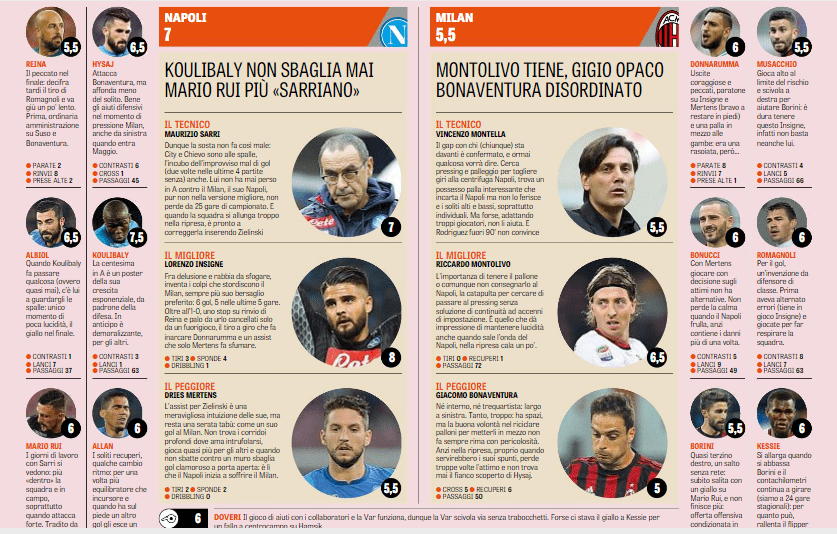 Come di consueto la Gazzetta dello Sport propone oggi voti e pagelle del match di ieri sera; in casa Milan tornano ad essere troppe le bocciature per i singoli: Giacomo Bonaventura, schierato da esterno sinistro, si becca un secco 5 in pagella per i tanti errori in fase offensiva. Stesso voto per Manuel Locatelli, anche lui piazzato fuori ruolo, e André Silva che continua ad essere un corpo estraneo. Insufficienti anche un Kalinic impalpabile e un Borini stavolta più caotico e meno lucido.