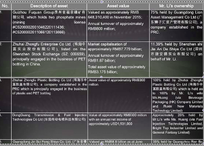 Carlo Festa de Il Sole 24 Ore ha tirato fuori dal suo libro ‘Berlusclosing’ delle immagini riguardanti i documenti che lo stesso mister Li ha consegnato alle banche cinesi al momento di ottenere i primi finanziamenti necessari. Come si vede le miniere di fosfati fanno capo a una holding, la Lion Asset Management, dove il 75% fa capo a Yonghong Li tramite prestanome. E proprio tramite prestanome l’uomo d’affari avrebbe costituito il suo piccolo impero attorno al Milan.