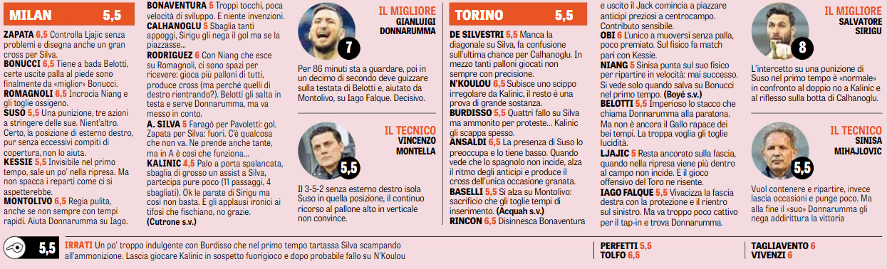 Troppe però ancora le note negative: Suso fatica da esterno nel centrocampo a cinque, Bonaventura e Calhanoglu risultano evanescenti e mai nel vivo del match. Voto 5 per André Silva che continua a soffrire le marcature dei difensori italiani, mentre il peggiore è ovviamente Kalinic. Voto 4.5 per il croato che sbaglia tutto il possibile sotto porta.
