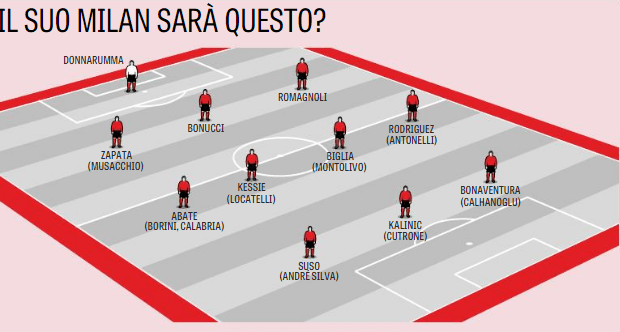 Dunque qualche cambiamento tra strategie e gerarchie dovrebbe essere apportato fin dal match di domenica a Benevento. La formazione tipo dovrebbe prevedere Donnarumma intoccabile tra i pali, la conferma della difesa a tre con Zapata, Bonucci e Romagnoli i più adatti a giocare titolari. Sulle corsie laterali possibile rilancio di Abate (ex compagno di squadra di Gattuso) a destra e Rodriguez confermato sulla sinistra. In mediana Kessié sarà affiancato da uno tra Biglia e Montolivo. Infine l’attacco: si torna al tridente vecchia maniera con Suso e Bonaventura larghi e Kalinic prima punta. Potrebbe cambiare invece il ruolo di André Silva, che nel 3-4-3 di partenza può anche essere inserito come esterno d’attacco piuttosto che come centravanti.