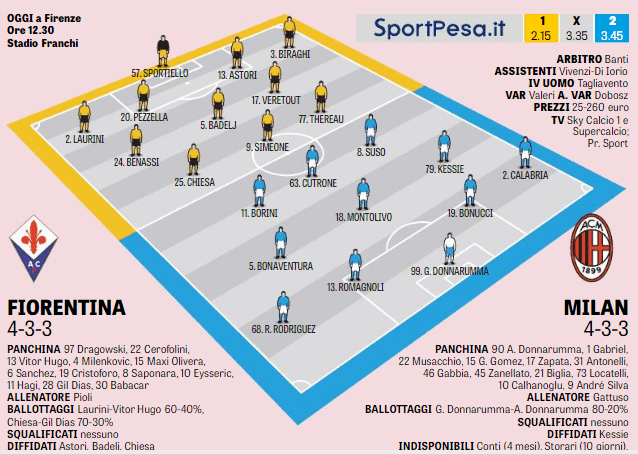Come di consueto la Gazzetta dello Sport anticipa la sfida, lunch-match della 19.a giornata di Serie A, pubblicando le probabili formazioni che si scontreranno al fischio di inizio del ‘Franchi’. Il Milan punterà sul solito 4-3-3 e su qualche cambiamento di formazione rispetto al derby di mercoledì.