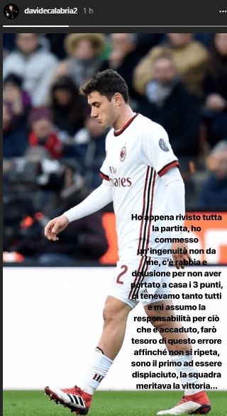 Il terzino rossonero dopo la partita ha scritto su Instagram le proprie scuse per quanto avvenuto. Questo il suo post nelle stories: “Ho appena rivisto tutta la partita, ho commesso un’ingenuità non da me, c’è rabbia e delusione per non aver portato a casa i tre punti, ci tenevamo tanto tutti e mi assumo la responsabilità per ciò che è accaduto. Farò tesoro di questo errore affinchè non si ripeta, sono il primo ad essere dispiaciuto, la squadra meritava la vittoria”.