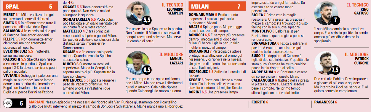Come al solito la Gazzetta dello Sport ha pubblicato oggi voti e pagelle ai calciatori scesi ieri in campo allo stadio ‘Mazza’; in casa Milan molti voti positivi, a cominciare ovviamente dal 7.5 per Patrick Cutrone, ormai vero e proprio cecchino d’area di rigore, giunto alla prima doppietta in carriera. Voto 7 per altri elementi-chiave del Milan: un Suso decisivo con i suoi strappi, un Romagnoli sempre attento e un Biglia ormai giunto ad altissimi livelli, autore anche del terzo gol rossonero.