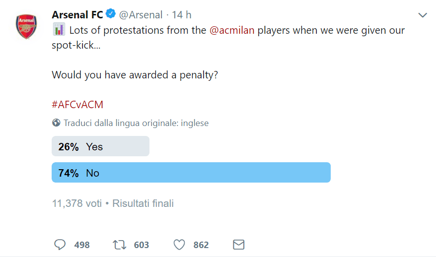 NEWS MILAN – L’Arsenal nel corso della partita contro il Milan ha pubblicato sul proprio profilo Twitter un sondaggio sul rigore concesso alla squadra di Arsène Wenger. Un episodio che ha generato grandi proteste rossonere.