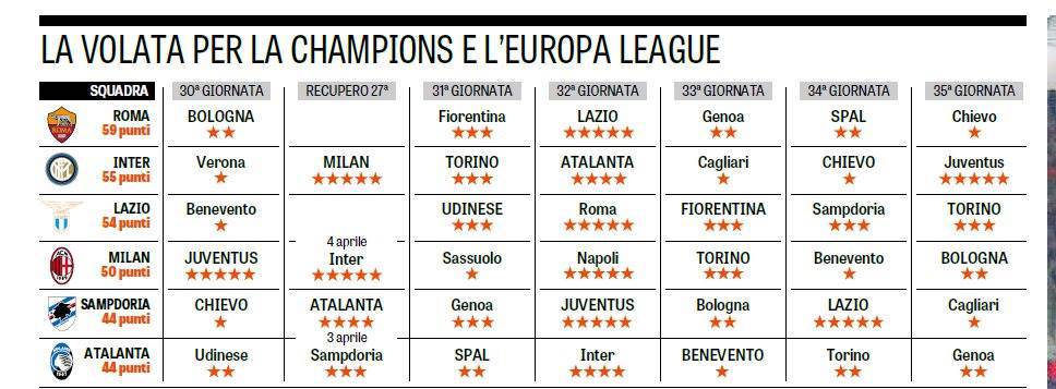 La Gazzetta dello Sport ha analizzato la volata per Champions ed Europa League fino alla 35a giornata. Il Milan affronterà tre match difficili e ravvicinati contro Juventus (al rientro), Inter (4 aprile) e Napoli (15 aprile). In mezzo il Sassuolo a San Siro, poi Torino, Benevento e Bologna. Percorso complicato anche per l’Inter: oltre al derby, Atalanta e Juventus fuori casa.