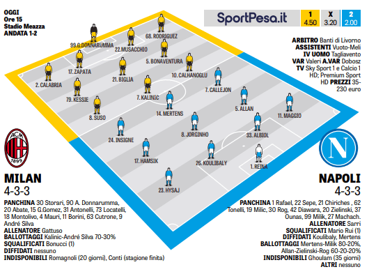 Due formazioni composte in maniera simile ma con qualità e caratteristiche differenti; entrambe amano giocare a calcio, ma il Milan punta più sulla solidità e sulle giocate di alcuni singoli, mentre il Napoli ragiona di squadra e si affiderà al classico gioco con palla a terra, scambi rapidi e inserimenti senza palla. Insomma, un esercizio di stile tra 4-3-3 differenti oggi per questa 32.a giornata di campionato.