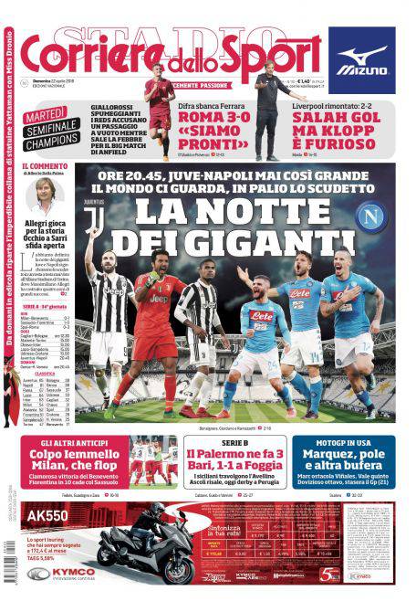 Gazzetta dello Sport, CorSport, Tuttosport: prime pagine del 22 aprile 2018 22/04/2018 - 08:25 di Keivan Karimi