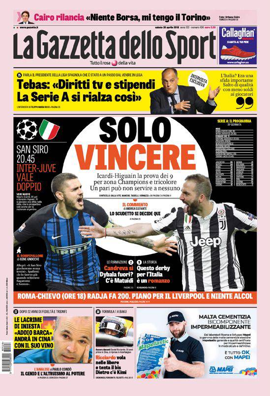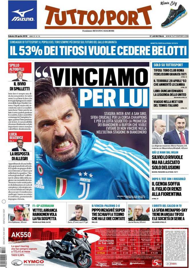 Gazzetta dello Sport, CorSport, Tuttosport: prime pagine del 28 aprile 2018 28/04/2018 - 08:21 di Keivan Karimi