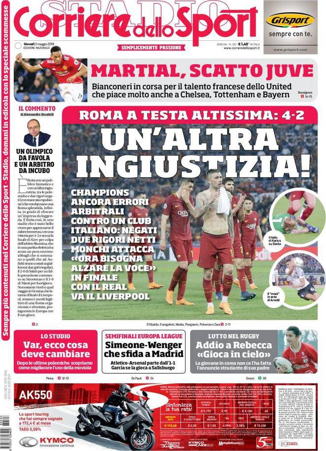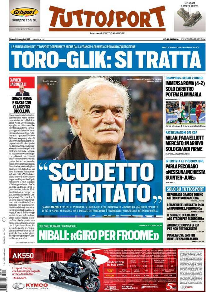 Gazzetta, Corriere dello Sport, Tuttosport: prime pagine 3 maggio 2017 03/05/2018 - 07:42 di Matteo B.