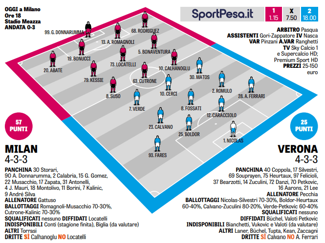 La Gazzetta dello Sport ha ipotizzato stamani le formazioni con cui Milan e Verona dovrebbero scendere in campo a San Siro tra qualche ora; come detto pochissimo turnover per i rossoneri, con Gattuso che sceglierà di far riposare il terzino destro Davide Calabria, sostituito dal veterano Ignazio Abate. Per il resto sarà il Milan titolare, con la conferma di Manuel Locatelli in cabina di regia ed il rientro di Alessio Romagnoli dopo l’infortunio muscolare. Nessun riposo anche per Suso e Calhanoglu, che vengono ormai considerati indispensabili per la manovra milanista.