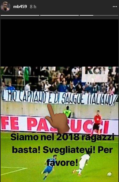 Ma non è stata una serata di soli sorrisi per Balotelli. Il quale, proprio sul suo profilo Instagram, ha risposto allo striscione esposto ieri a San Gallo (in Svizzera) durante il match contro l’Arabia Saudita: “Il mio capitano è di sangue italiano“, frase riferita alla possibilità per l’attaccante di indossare la fascia di capitano qualora dovesse mancare Leonardo Bonucci nei titolari (in Nazionale indossa la fascia quello con più presenze e, fra i convocati attuali, SuperMario viene subito dopo il difensore del Milan). “Siamo nel 2018 ragazzi, basta. Svegliatevi, per favore“, ha scritto il calciatore nelle Stories di Instagram.