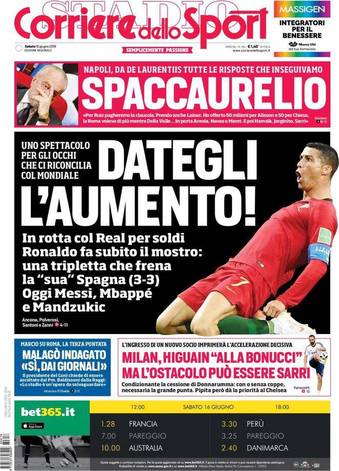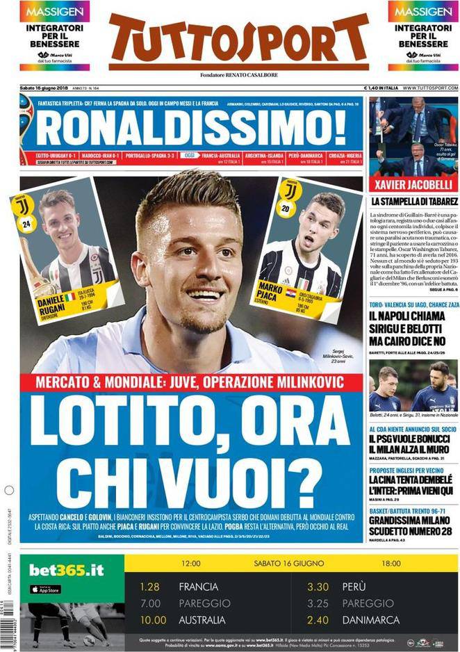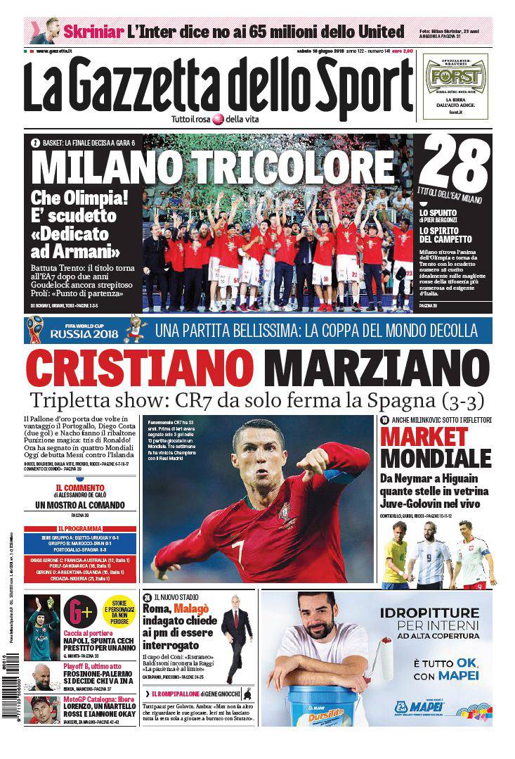 Gazzetta dello Sport, CorSport, Tuttosport: prime pagine del 16 giugno 2018 16/06/2018 - 08:13 di Keivan Karimi