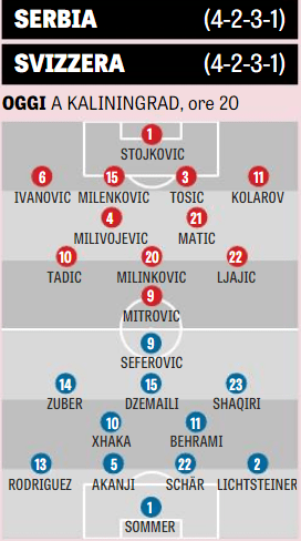 Secondo la Gazzetta dello Sport il terzino del Milan e della selezione svizzera Ricardo Rodriguez sarà naturalmente confermato titolare nello scacchiere tattico del c.t. Petkovic. Il difensore rossonero, dopo la buona prova contro Neymar e compagni, dovrà confermarsi a buoni livelli nel 4-2-3-1 elvetico, che vedrà la presenza dal 1′ minuto anche di altri ‘italiani’ come Lichtsteiner, Berhami e Dzemaili. Occhio però alle qualità dei serbi che vantano in rosa dei fuoriclasse assoluti, come il romanista Kolarov, il granata Ljajic o il laziale Milinkovic-Savic. Calcio d’inizio alle ore 20 presso lo stadio di Kaliningrad.