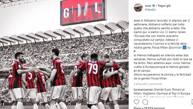 Un messaggio, quello del difensore, che ha allontanato l’ipotesi di cessione. E adesso si può dire la stessa cosa di Suso, anche lui dato per possibile sacrificato ma autore di un bellissimo messaggio su Instagram. Lo spagnolo ha scritto la seguente didascalia sotto una foto che immortala un abbraccio della squadra rossonera:
