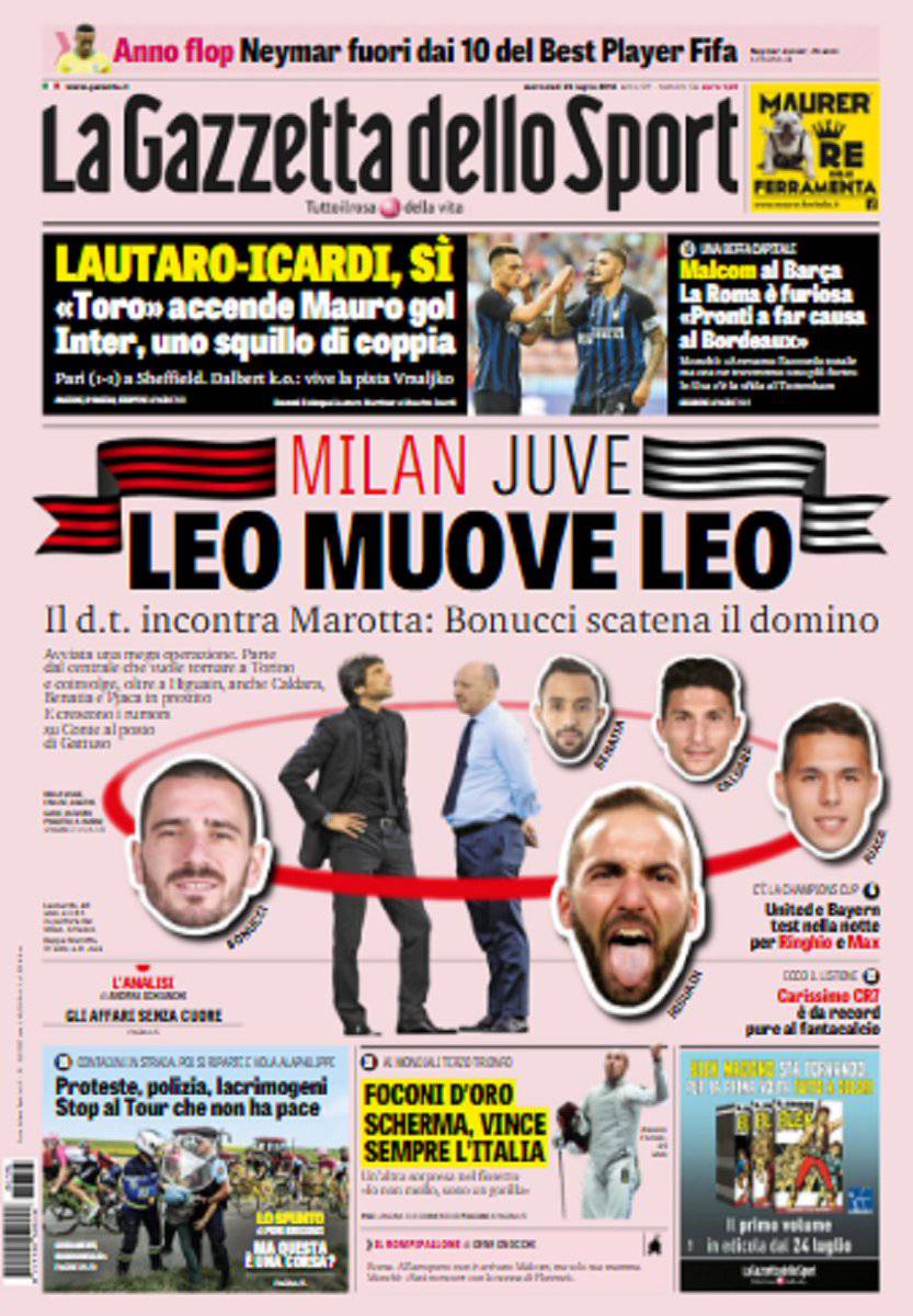 Gazzetta dello Sport, CorSport, Tuttosport: prime pagine del 25 luglio 2018 25/07/2018 - 08:08 di Keivan Karimi