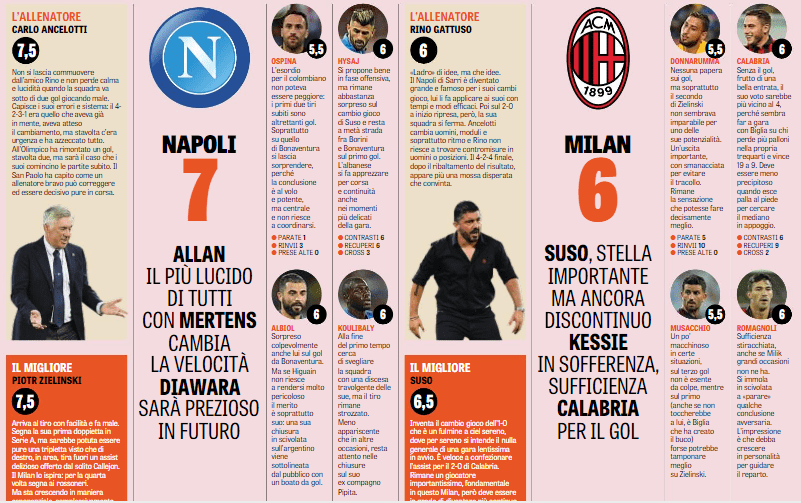Bocciato invece Lucas Biglia, voto 5, troppi palloni sanguinosi persi ed errori che uno come lui non deve mai commettere. Sotto la sufficienza anche un Donnarumma apparso poco reattivo sui gol del Napoli, un Musacchio ancora pericolante e pure un Rodriguez che in fase difensiva ha sofferto da matti.