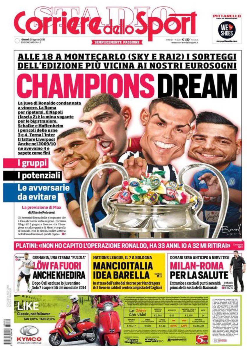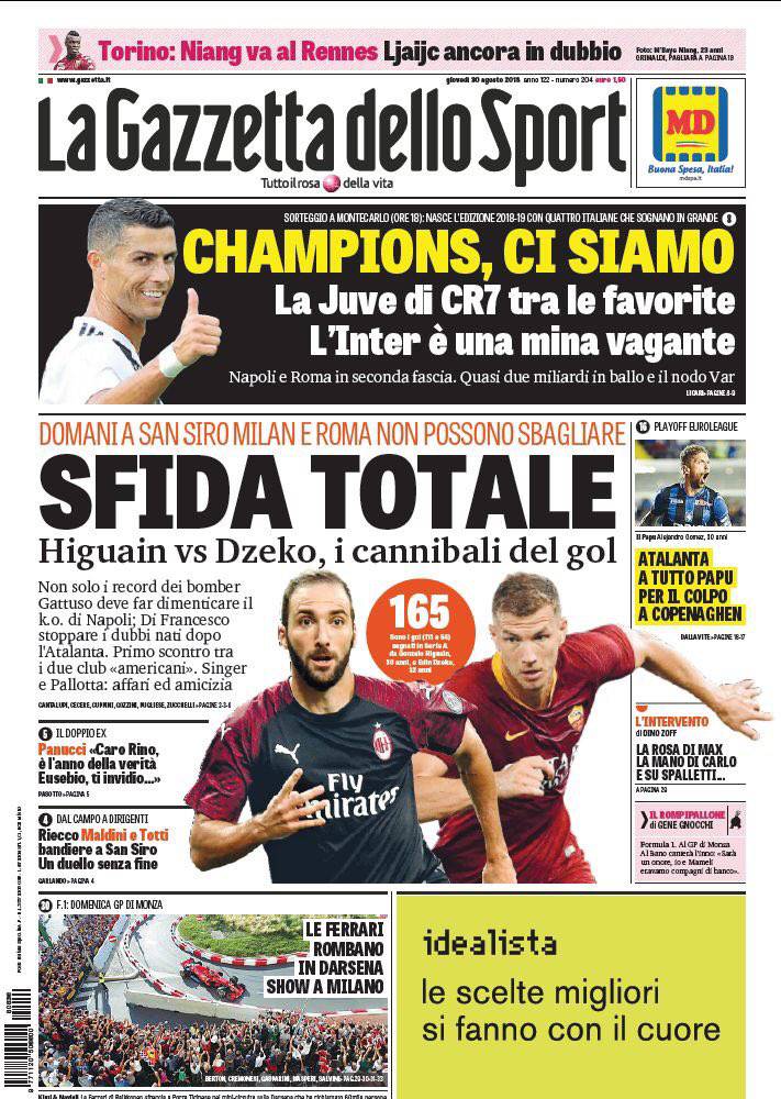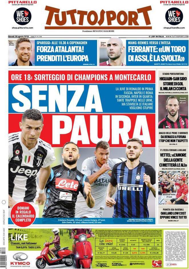 Gazzetta, Corriere dello Sport, Tuttosport: prima pagina 30 agosto 2018 30/08/2018 - 08:29 di Matteo B.