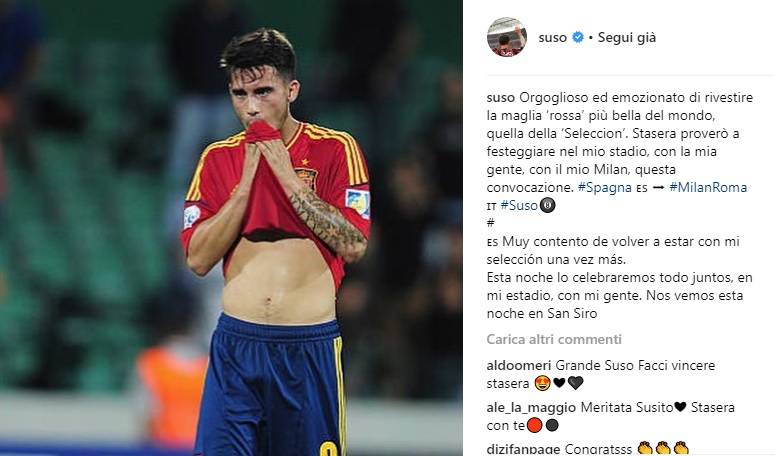 Il commissario tecnico Luis Enrique ha dato il via alla sua rivoluzione e ha deciso di convocare anche il milanista Suso, autore di un buon debutto in campionato contro il Napoli con un assist e un po’ di belle giocate. Il numero otto rossonero ha commentato su Instagram la chiamata della sua Nazionale: