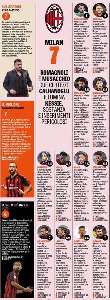 Prova positiva anche per la difesa, con la cerniera Musacchio-Romagnoli premiata con un 6.5 in pagella che certifica il buon lavoro della coppia contro Dzeko e compagni. Stesso voto anche per alcuni elementi in crescita, come Rodriguez, Kessié e Biglia, tutti positivi rispetto al flop di Napoli. Infine il ‘meno brillante’ della serata risulta Jesus Suso: solo 6 in pagella per lo spagnolo che si accende ad intermittenza, ma questo Milan sa vincere anche senza le sue invenzioni.