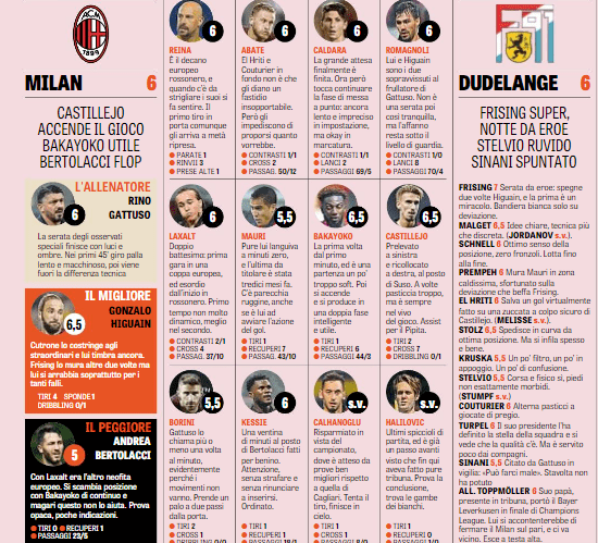 Come riporta la Gazzetta dello Sport nelle consuete pagelle del giorno dopo, le prove dei singoli rossoneri scesi in campo ieri in Lussemburgo si dividono tra promozioni meritate e bocciature eccellenti. Cominciando con i più positivi, ovvi gli encomi per Gonzalo Higuain, autore del gol vittoria e di tante giocate da leader dell’attacco qual è. Voto 6.5 per lui ma anche per Samu Castillejo, vivace anche se caotico, e Timoué Bakayoko, già a suo agio nella linea di centrocampo.