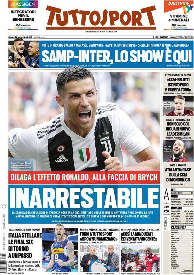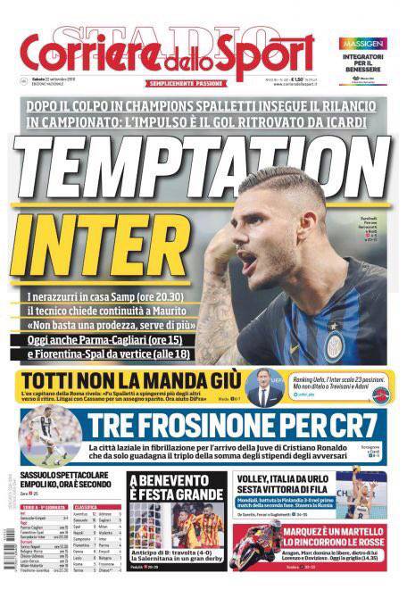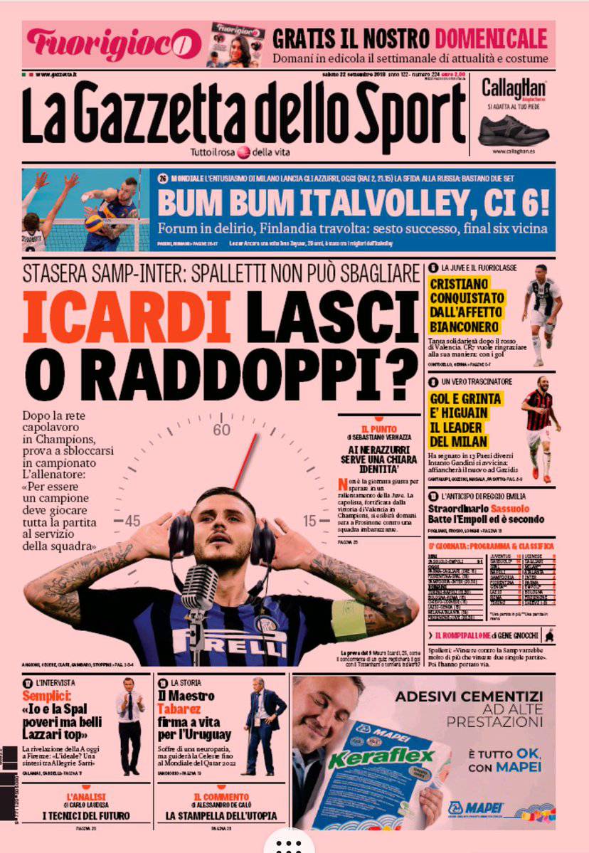 Gazzetta dello Sport, CorSport, Tuttosport: prime pagine del 22 settembre 2018 22/09/2018 - 08:07 di Keivan Karimi
