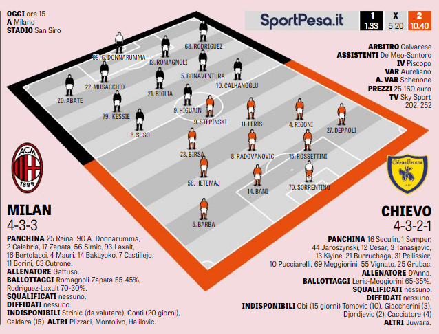 Per sfidare il Chievo Verona fanalino di coda, ancora fermo al -1 in classifica per via della penalizzazione inflitta dalla Corte Federale, il Milan si schiererà con l’artiglieria pesante. Dimenticato il turnover visto contro l’Olympiacos, Gattuso ritrova tutti gli effettivi titolari per il suo 4-3-3 ormai classico, anche se qualche sorpresa dell’ultima ora non è esclusa, soprattutto per le condizioni fisiche di qualche calciatore.