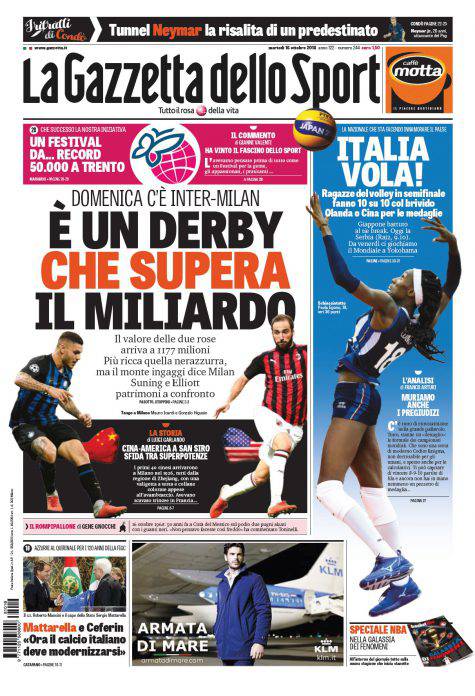 Gazzetta dello Sport, Corsport e Tuttosport: prime pagine del 16 ottobre 2018 16/10/2018 - 07:58 di Pasquale Cacciola