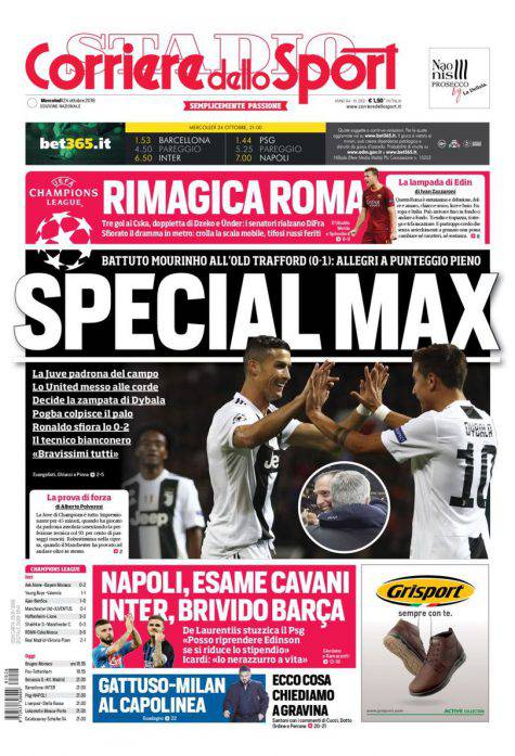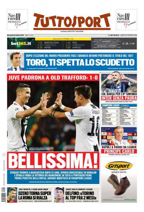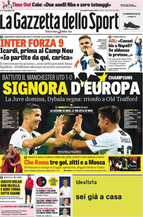 Gazzetta dello Sport, Corsport, Tuttosport: prime pagine del 24 ottobre 2018 24/10/2018 - 08:01 di Pasquale Cacciola