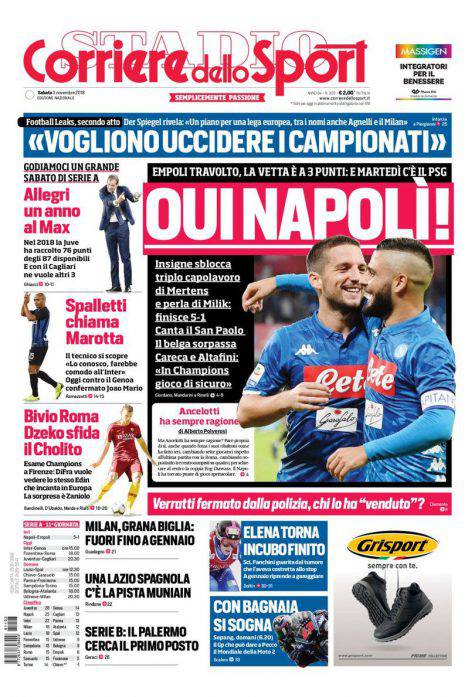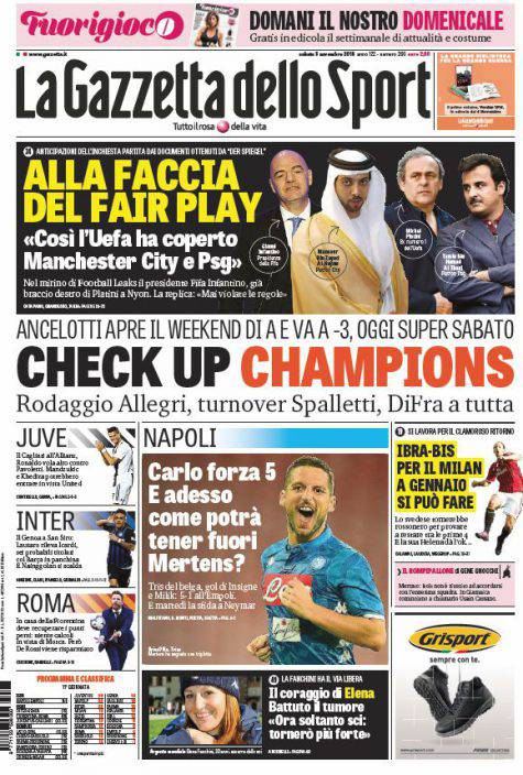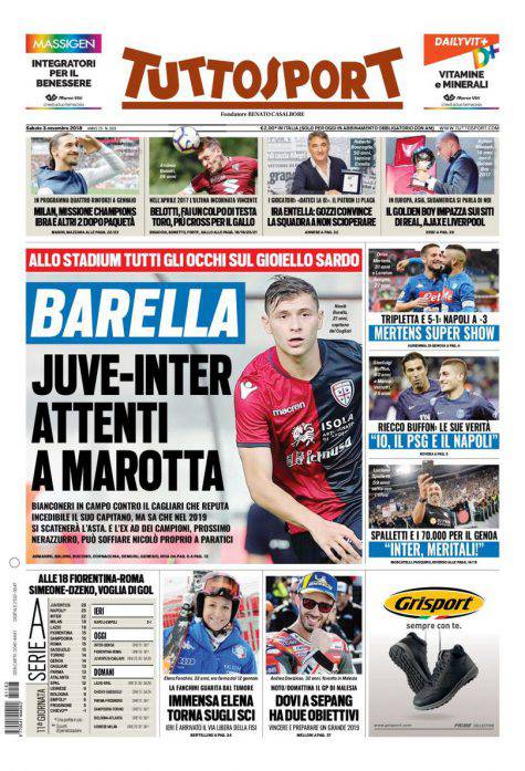 Gazzetta dello Sport, Corsport, Tuttosport: prime pagine del 3 novembre 2018 03/11/2018 - 08:10 di Pasquale Cacciola