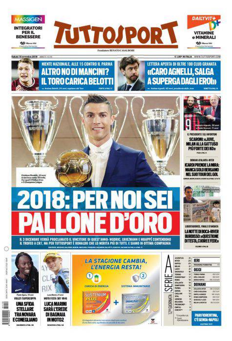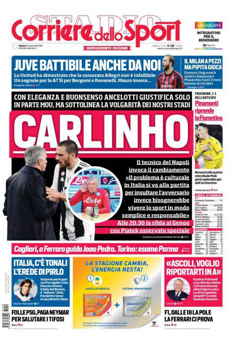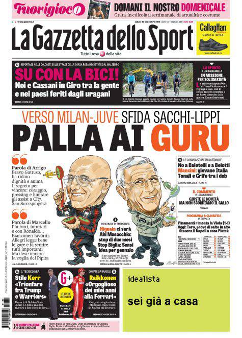 Gazzetta dello Sport, Corsport, Tuttosport: prime pagine del 10 novembre 2018 10/11/2018 - 08:06 di Pasquale Cacciola