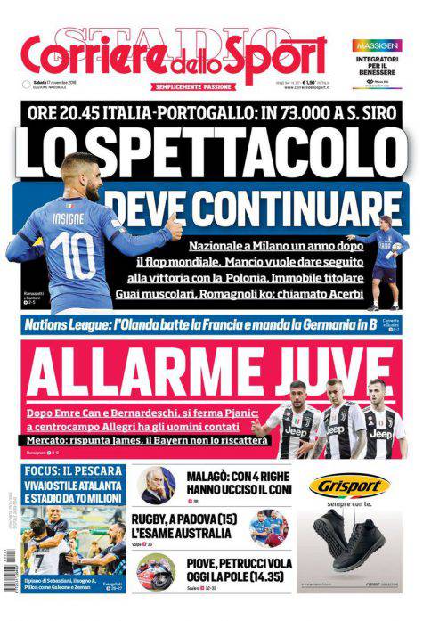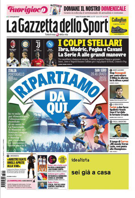 Gazzetta dello Sport, CorSport e Tuttosport: prime pagine del 17 novembre 2018 17/11/2018 - 08:06 di Pasquale Cacciola