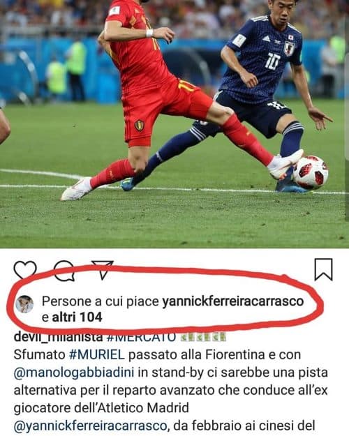 Nelle scorse ore è anche emerso un indizio social in merito al possibile approdo di Carrasco al Milan. Il belga ha messo un like su un post apparso su Instagram che lo accostava al club rossonero. Probabilmente è un po’ poco per dire che l’operazione sia in dirittura d’arrivo o comunque molto concreta. Però può essere un segnale dell’apprezzamento dell’ex Atletico Madrid per la destinazione. Sicuramente a mister Gattuso uno come lui farebbe molto comodo. Le qualità di Carrasco sono innegabili.
